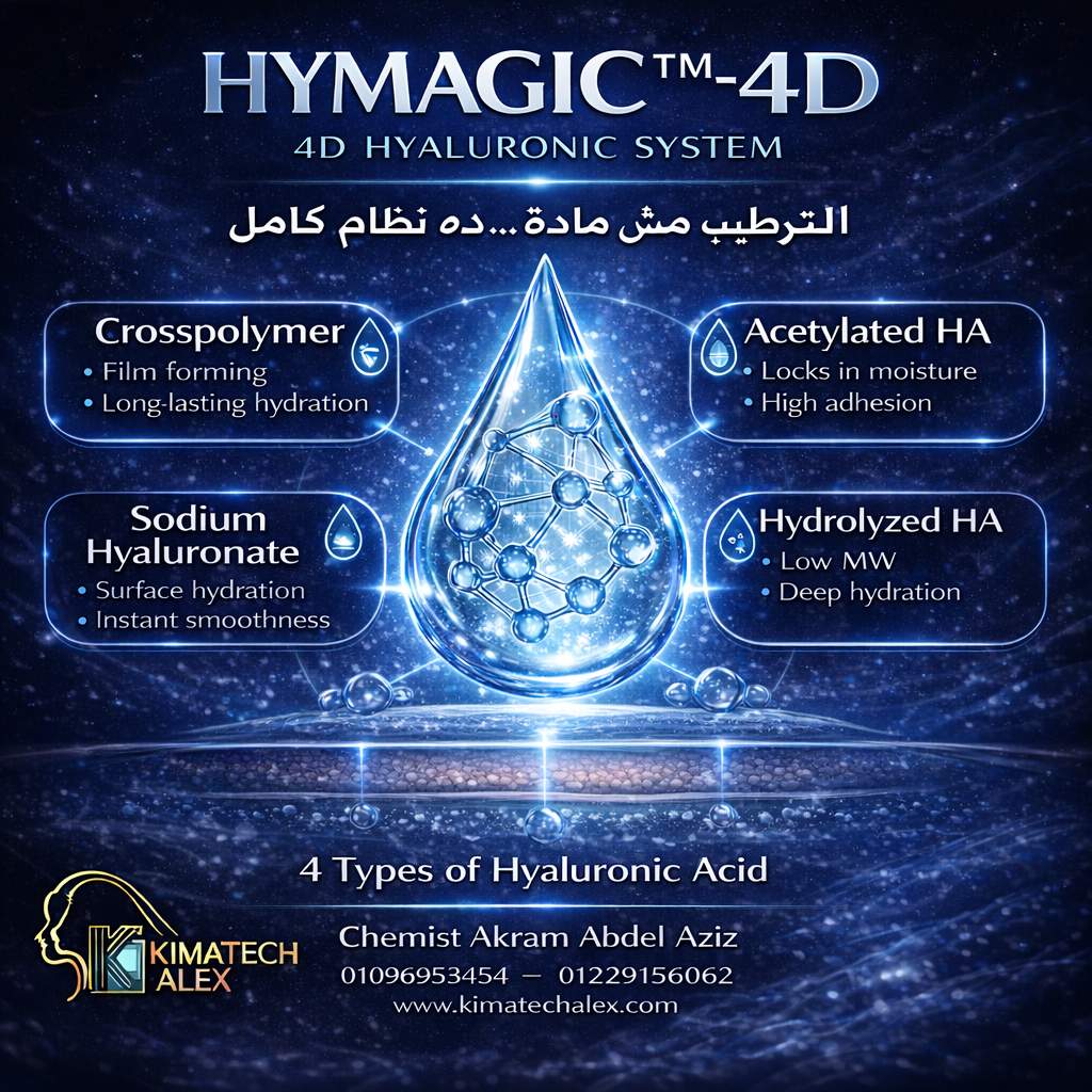 Hymagic™-4D هو نظام ترطيب متطور يعتمد على مزيج من أربعة أنواع من Sodium Hyaluronate مختلفة في الوزن الجزيئي والتركيب، مما يسمح بتكوين شبكة ترطيب ثلاثية الأبعاد (3D Hydration Network) تستهدف طبقات الجلد المختلفة بكفاءة.